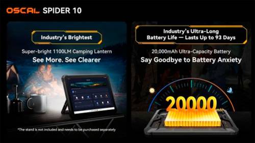 SPIDER 10 є преміальною пропозицією з найяскравішим у пристроях цієї категорії кемпінговим ліхтарем на 1100 лм. Планшет також має камеру нічного бачення з роздільною здатністю 20 Мп. Сертифікат військового рівня MIL-STD-810H та ступеня захисту від води та пилу IP68 та IP69K вказують на найвищу міцність та тривалий термін служби пристрою.