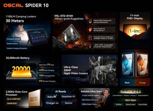 OSCAL SPIDER 10 працює під управлінням програмної оболонки DokeOS_P 4.2 поверх системи Android 15. Він має ексклюзивну технологію Doke AI, до складу якої увійшли три найбільш просунуті моделі штучного інтелекту: DeepSeek-R1, ChatGPT-4o mini та Gemini AI 2.0. Користувачі можуть керувати пристроєм без рук одними голосовими командами та миттєво отримувати доступ до екранних підказок, щоб не відволікатися від робочого процесу.