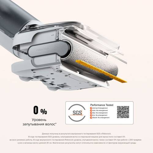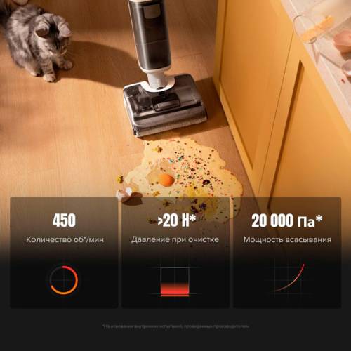 Подвійний спіральний повітропровід зводить до мінімуму втрати повітряного потоку. Прогумована основна щітка та структура бічних щіток не дозволяють сплутуватися волоссю. Для захисту килимів та при поверненні на зарядку миючий модуль автоматично піднімається на висоту 8 см.