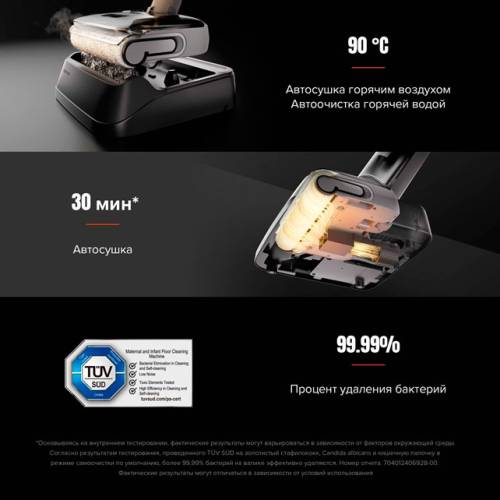 Творці цього пилососа подумали не лише про прибирання приміщення, а й про чистоту самого пристрою. Її допомагає підтримувати високотемпературна система самоочищення. Щітка здатна працювати у двох напрямках, ефективно видаляючи бруд та сміття, розчиняючи масло та зводячи до мінімуму необхідність чистити підлогу вручну.