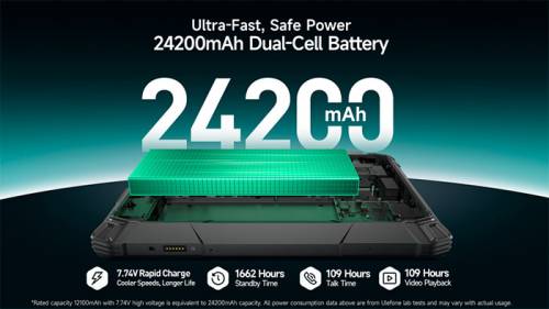 Окрім інноваційного проектора, планшети серії Armor Pad 5 створені для роботи в екстремальних умовах. В їх основі лежить двоелементний акумулятор ємністю 24200 мАг, що підтримує надшвидку зарядку потужністю 120 Вт. З нею акумулятор з 0% до 20% заряджається лише за 10 хвилин. Планшети оснащені функцією зворотного заряджання потужністю 10 Вт, що робить їх потужним зовнішнім акумулятором для інших пристроїв.